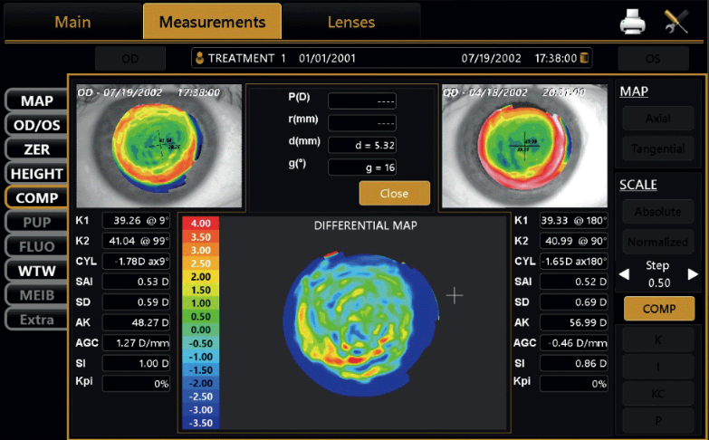 Maps corneal curvature and visit-to-visit comparison, which provides valuable information to assess keratoconus probability and supports specialty contact lens fitting. The differential map allows observation of the effects of refractive surgery and orthokeratology lenses. White-to-white measurements are automatically calculated during topography to facilitate the selection of contact lens diameter.