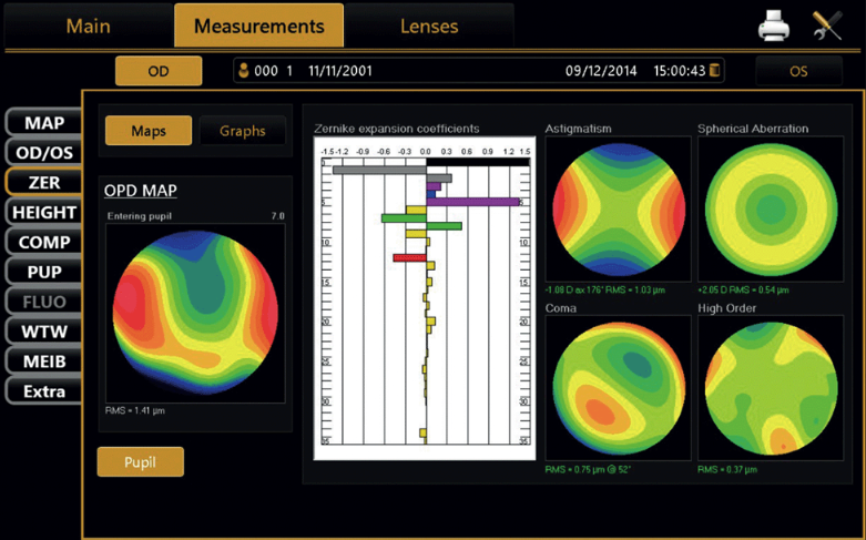 Displays maps of higher order aberrations of the eye over different pupil sizes and simulates the effect on the patient’s visual quality, to enhance optical recommendations or contact lens parameters.